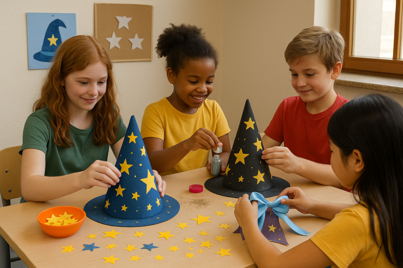 warsztaty plastyczne, na których dzieci projektują własne czapki czarodziejów - z zakręconym szczytem, błyszczącymi dodatkami i unikalnymi symbolami.