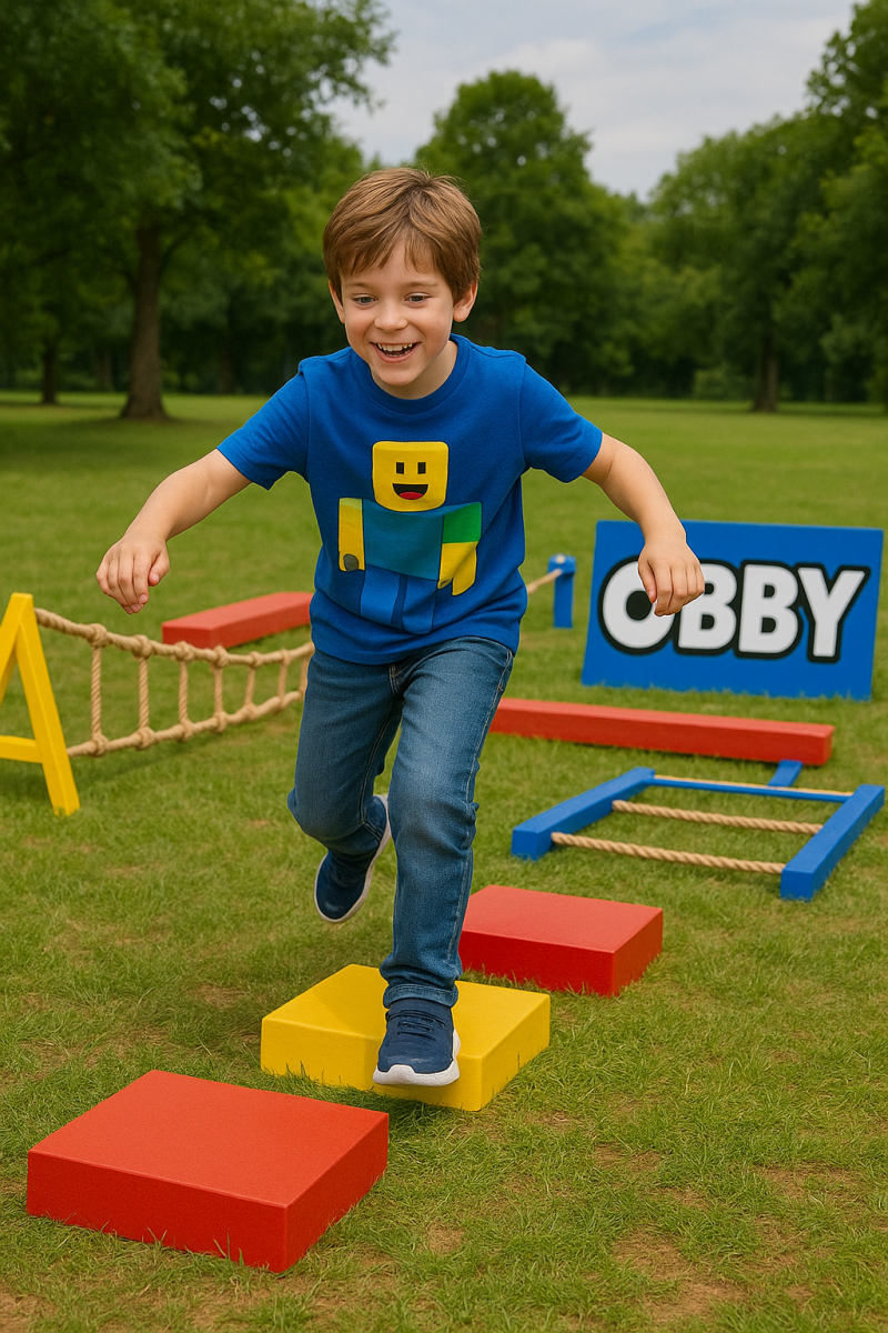 Razem pokonamy tor przeszkód inspirowany parkourem z Roblox: skoki po „lawie”, równoważnia, przejścia po linach i mini-wyzwania zręcznościowe. Kto dotrze do mety jako pierwszy?